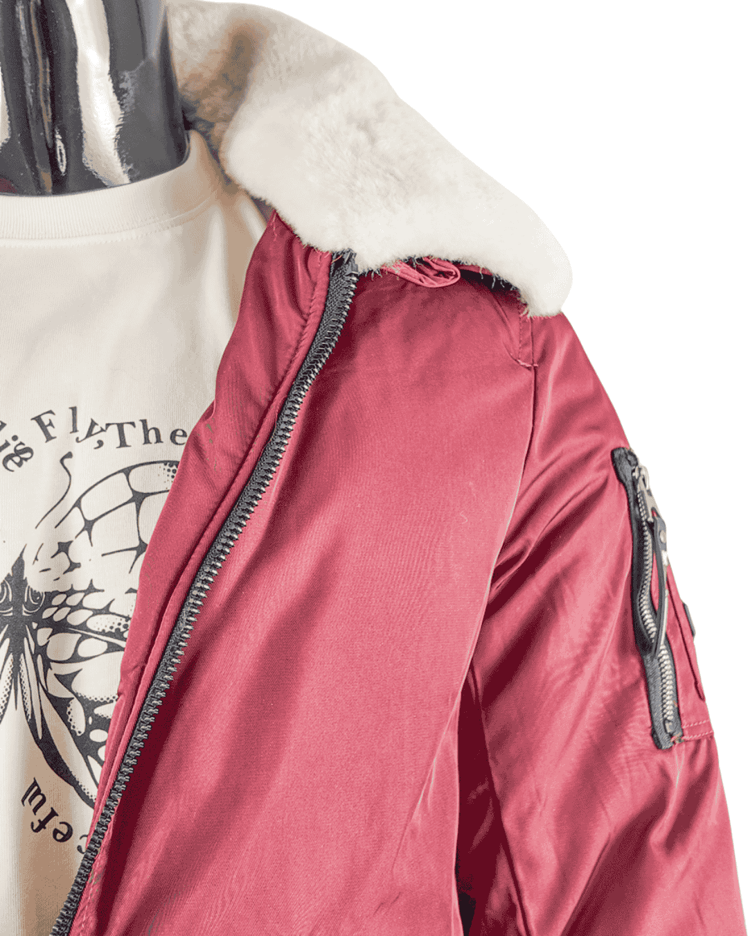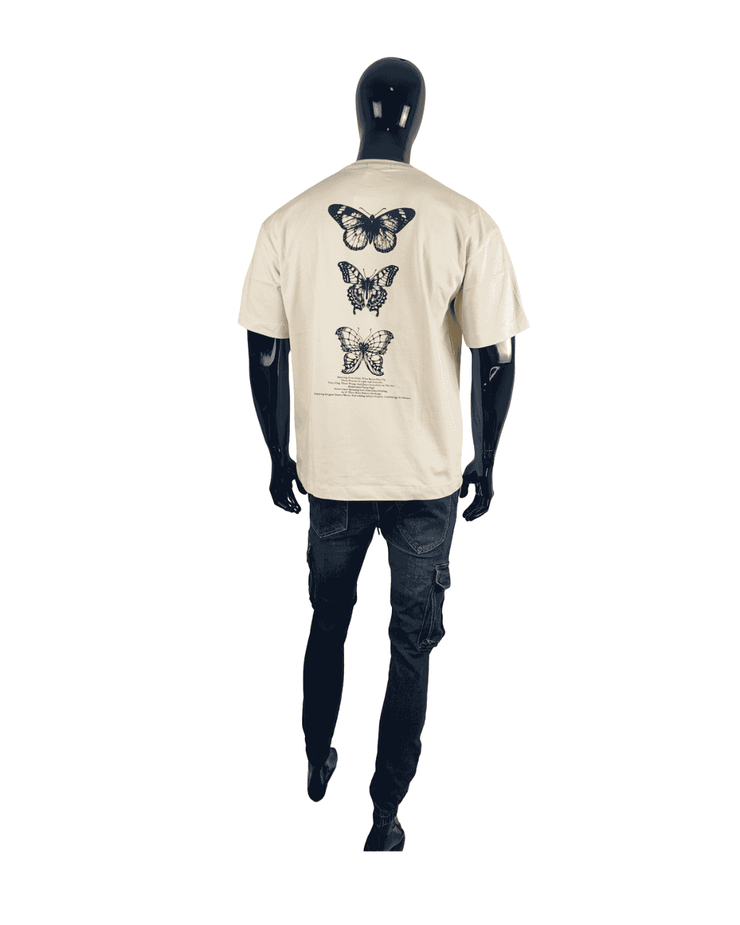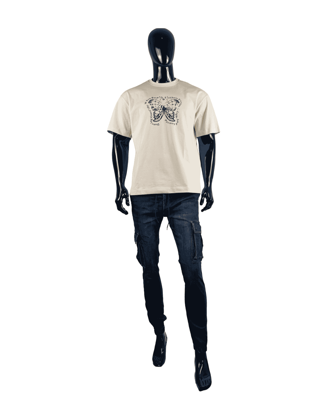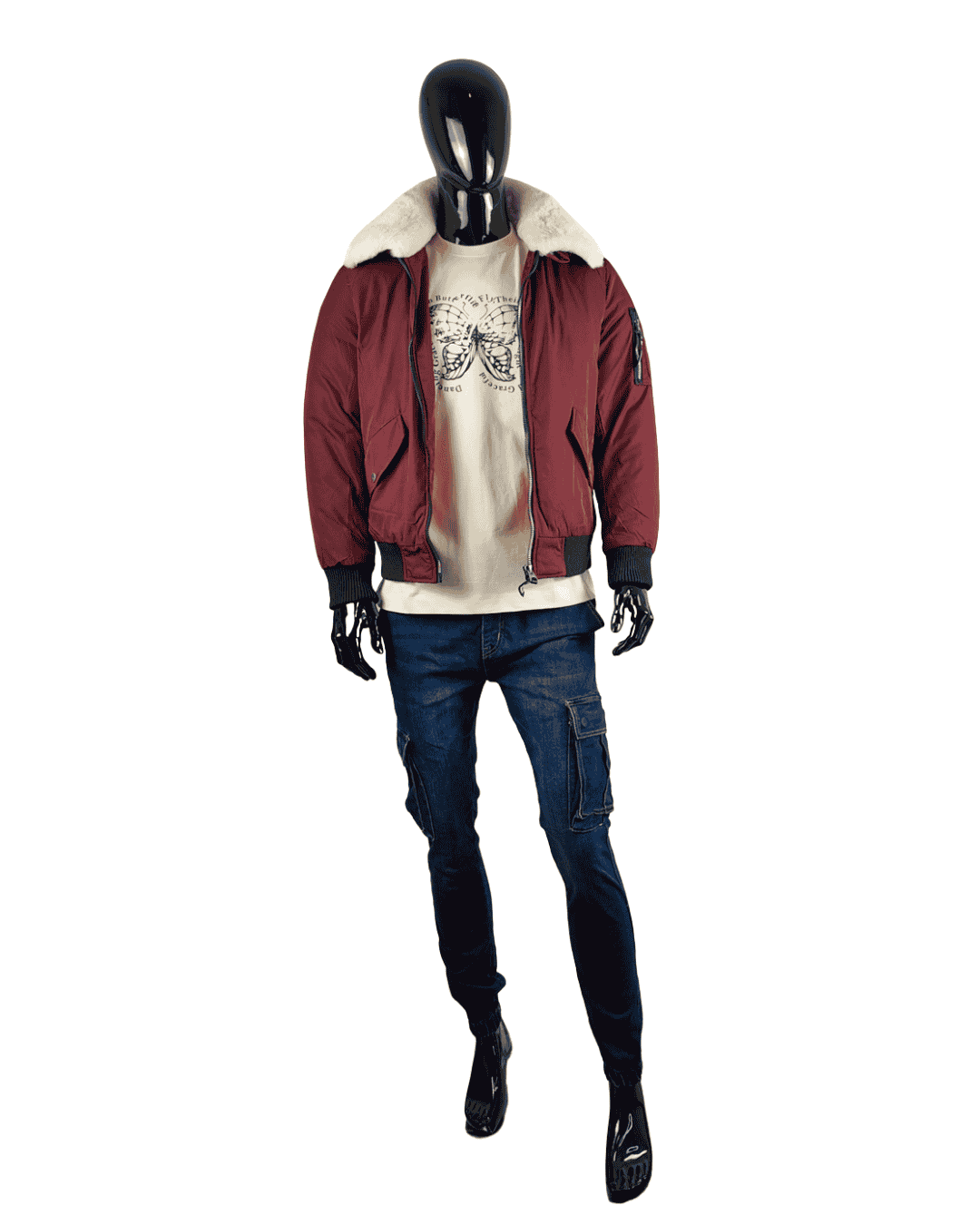 Este look masculino combina tendencia y comodidad en un outfit con carácter. La camiseta oversize beige con estampado de mariposas en negro aporta un toque moderno y diferente, perfecta para marcar estilo sin perder frescura. El chaquetón granate con cuello de pelo blanco largo suma personalidad y abrigo, convirtiéndose en la prenda clave del conjunto. El pantalón vaquero cargo en azul marino completa el look con funcionalidad y un aire streetwear actual.